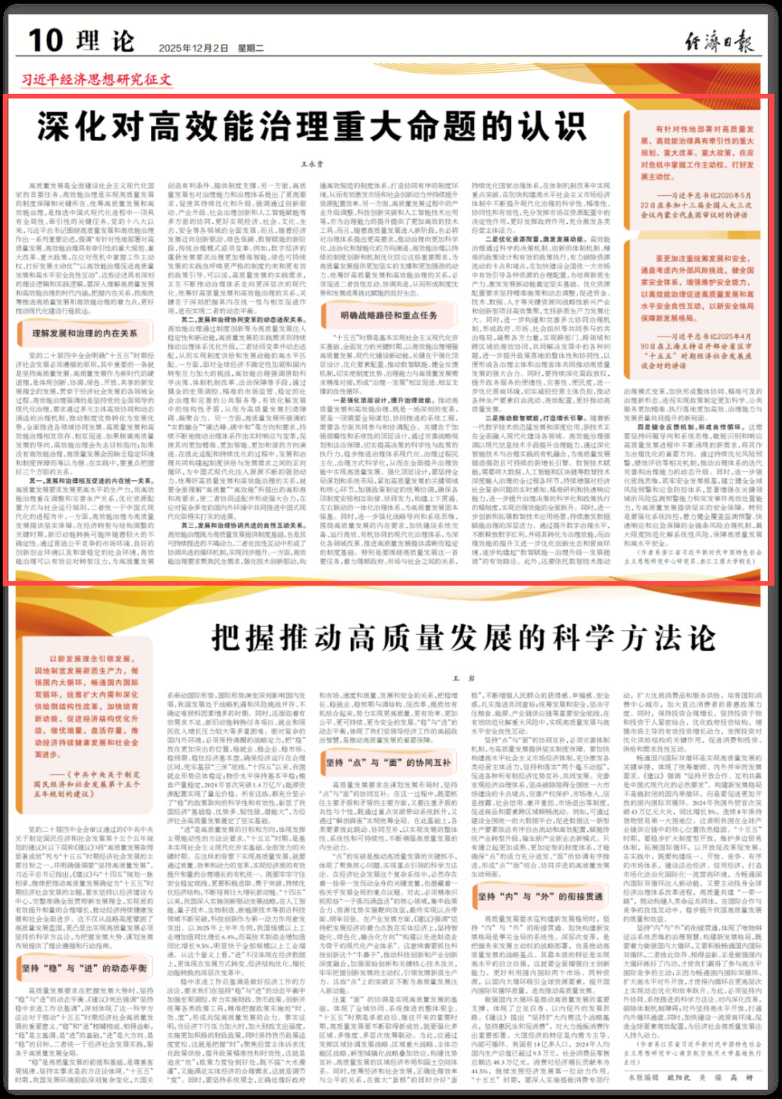 近日,浙江工商大学校长、工商管理学院(MBA学院)王永贵教授在《经济日报》理论版发表文章《深化对高效能治理重大命题的认识》。